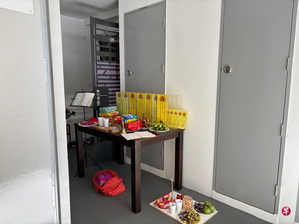 女居民被指搬入大巴窑组屋后每月在走廊开坛做法事,邻居一开门就见祭台上放满灵牌、祭品,心神不安直呼“班当”(pantang,马来语,忌讳的意思)。