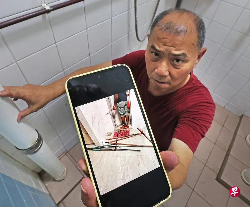 裕廊西一组屋单位的厕所半年来几乎每天都有泡沫从排水口冒出,屋主求助无门,聘请承包商检查,竟在楼下水管里惊见三根竹竿,令人匪夷所思。